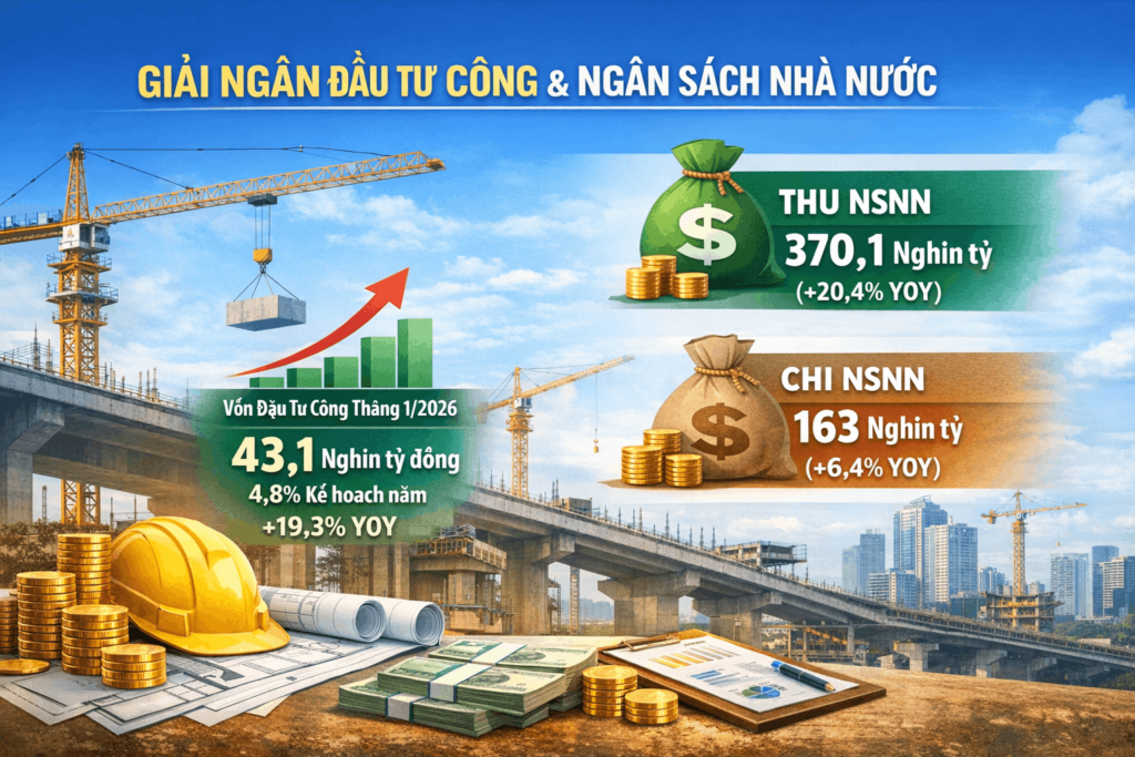 • Thu NSNN tháng 1/2026 đạt 370,1 nghìn tỷ đồng, tương đương 14,7% dự toán năm, tăng 20,4% so với cùng kỳ.