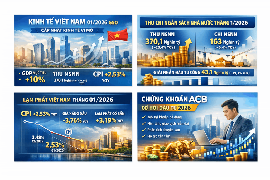 Trong bài viết này, chúng tôi cập nhật số liệu kinh tế vĩ mô Việt Nam tháng 01/2026 (GSO), đồng thời đưa ra nhận định xu hướng thị trường và gợi ý cho nhà đầu tư khi mở tài khoản chứng khoán ACB.