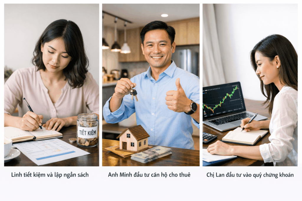 Ví dụ thực tế: Linh, một người đã có gia đình, làm việc tại một công ty với thu nhập hàng tháng khoảng 15 triệu đồng. Sau khi tính toán các khoản chi tiêu thiết yếu (như tiền thuê nhà, chi phí sinh hoạt, trả nợ), Linh nhận thấy rằng cô ấy có thể tiết kiệm được khoảng 2 triệu đồng mỗi tháng. Điều này giúp Linh bắt đầu xây dựng quỹ dự phòng và cũng mở ra cơ hội để cô ấy đầu tư vào các lĩnh vực như chứng khoán và bất động sản.